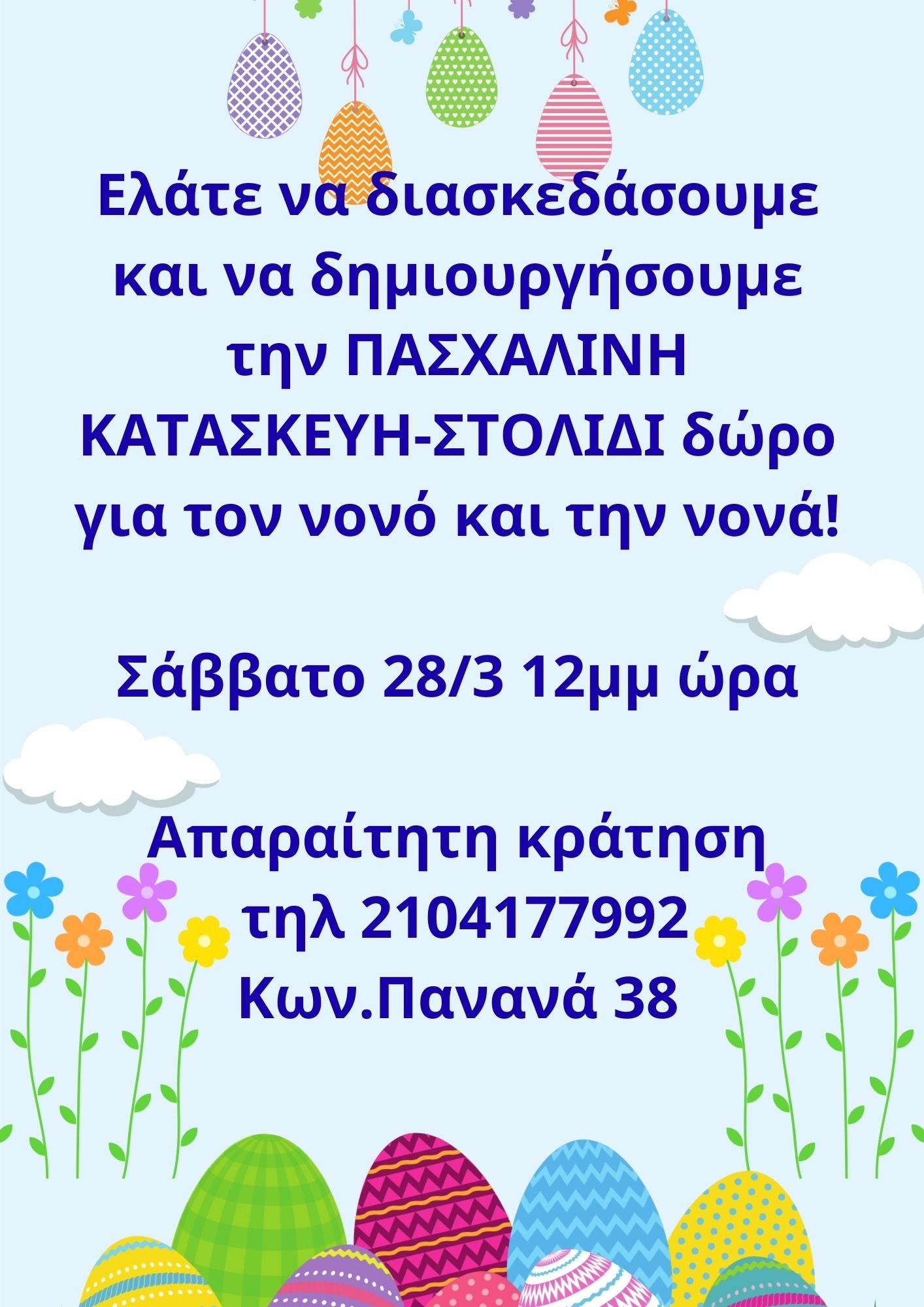 Ελάτε στο καλλιτεχνικό μας εργαστήρι να δημιουργήσουμε όμορφες Πασχαλινές κατασκευές για τους αγαπημένους μας !!