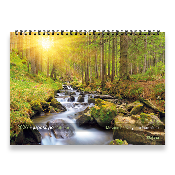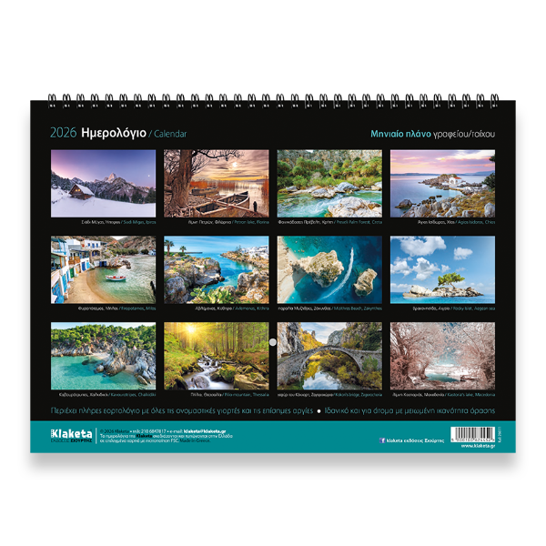 Ένα μεγάλο σε σχήμα ημερολόγιο τοίχου, με μεγάλους χώρους για σημειώσεις και 12 ξεχωριστές φωτογραφίες τοπίων από την ελληνική φύση.
