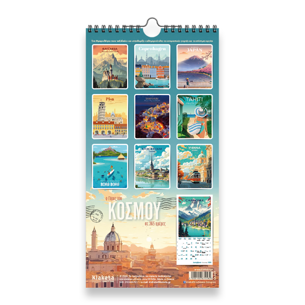 Ένα μικρότερο σε σχήμα ημερολόγιο τοίχου, της αγαπημένης σειράς “Ο Γύρος του Κόσμου, σε 365 ημέρες”, με 12 Travel Posters από ισάριθμους προορισμούς του κόσμου μας. Αγοράζεται για την ξεχωριστή αισθητική του, από όσους αγαπάνε να ταξιδεύουν!