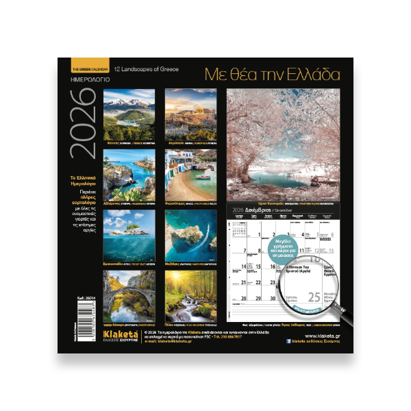Μόλις κυκλοφόρησε το μεσαίο σε σχήμα ημερολόγιο τοίχου, με 12 πολύχρωμα τοπία της ελληνικής φύσης, μέσα από τον φακό ταλαντούχων Ελλήνων και ξένων φωτογράφων