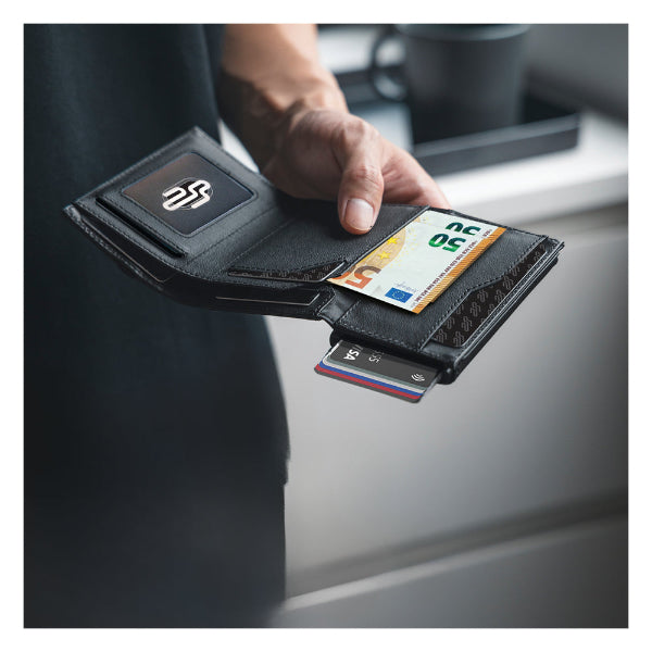 • Η καρτοθήκη έχει προστασία RFID/NFC που προστατεύει από ηλεκτρονική υποκλοπή σε περίπτωση επαφής με το πορτοφόλι σας.